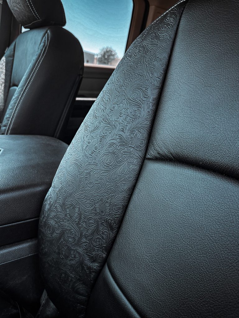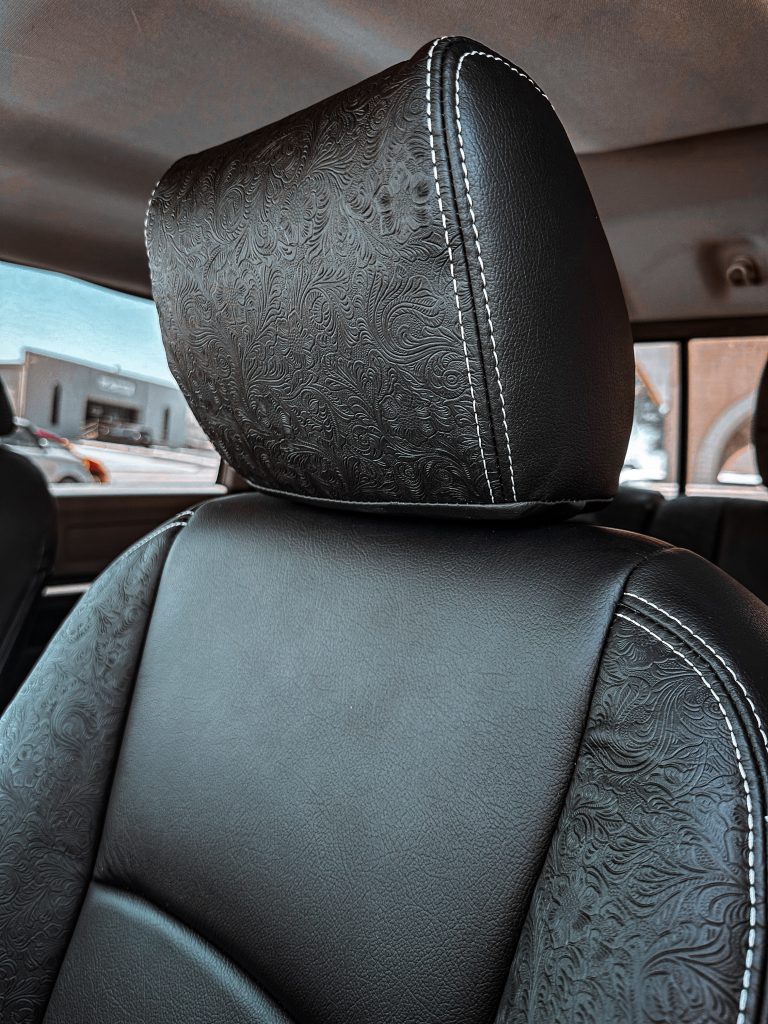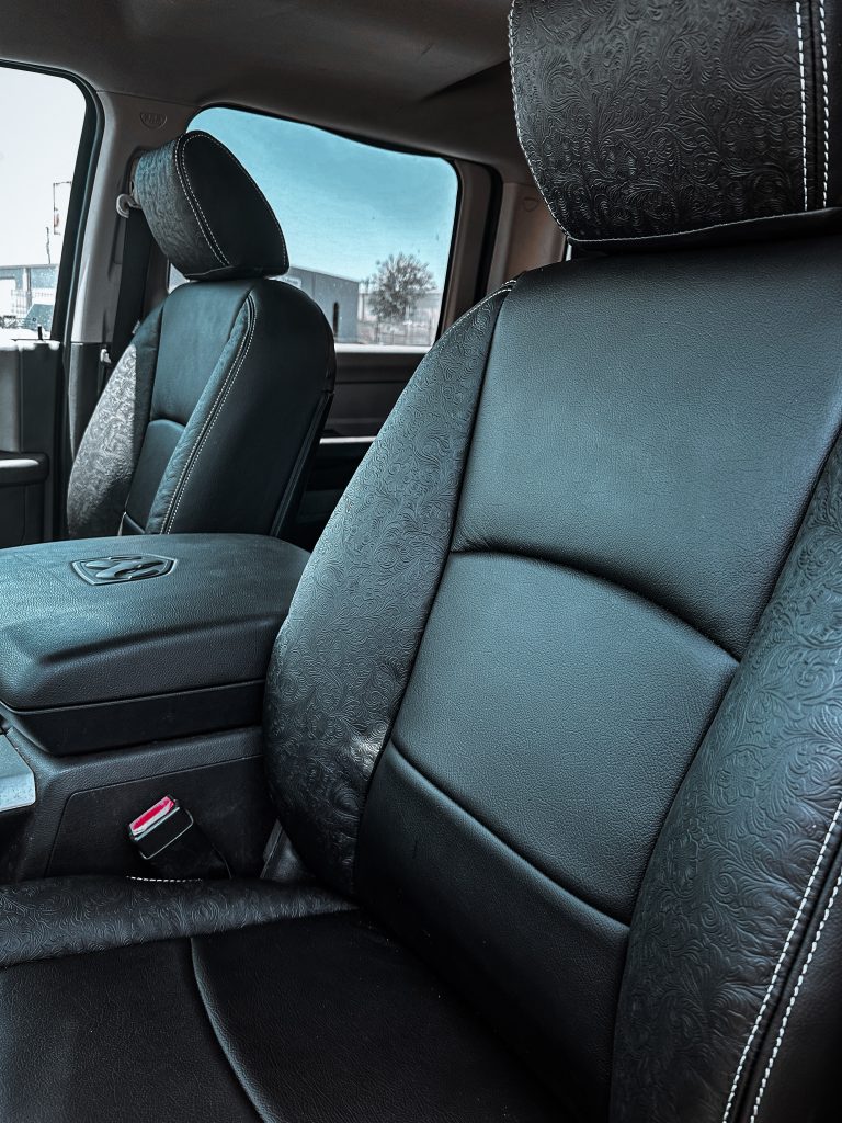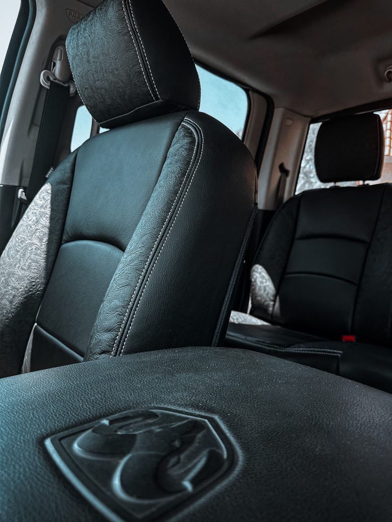 2012 Dodge Ram Crew Cab- Leather 2012 Dodge Ram Crew Cab #97806- Black Outlaw Leather, Black Wings & Headrest with Silver Stitching