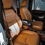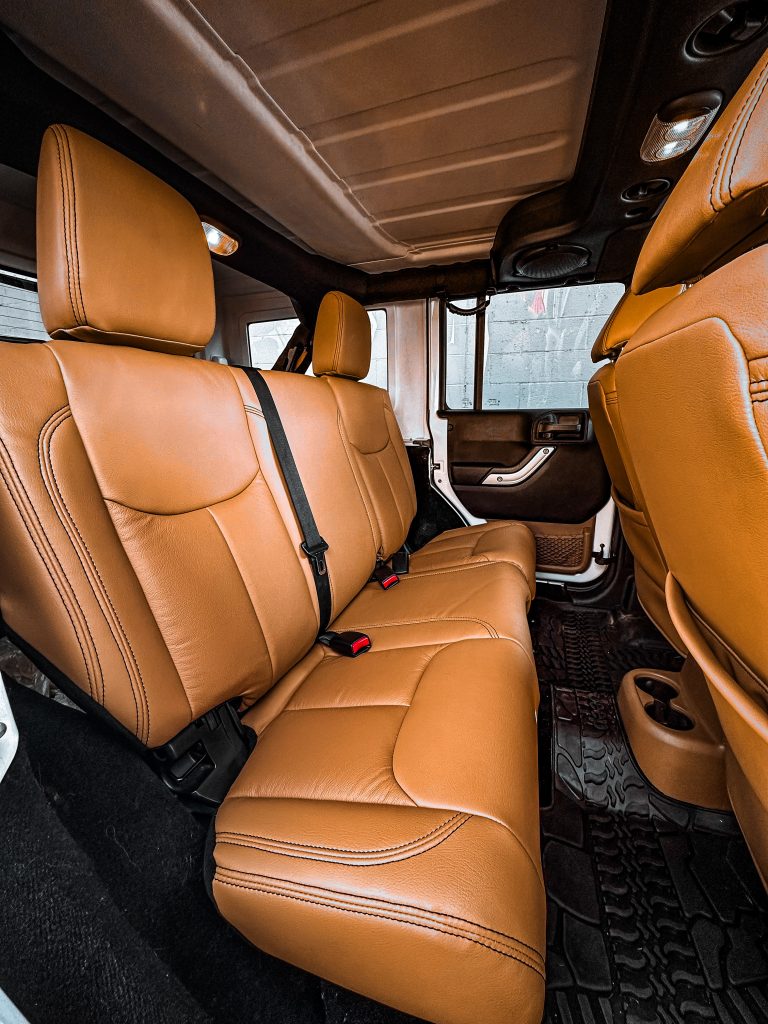 2014 Jeep Wrangler- Leather 2014 Jeep Wrangler #98505 – Logo Outline in Eggshell, Camel Leather with Black Double Stitching